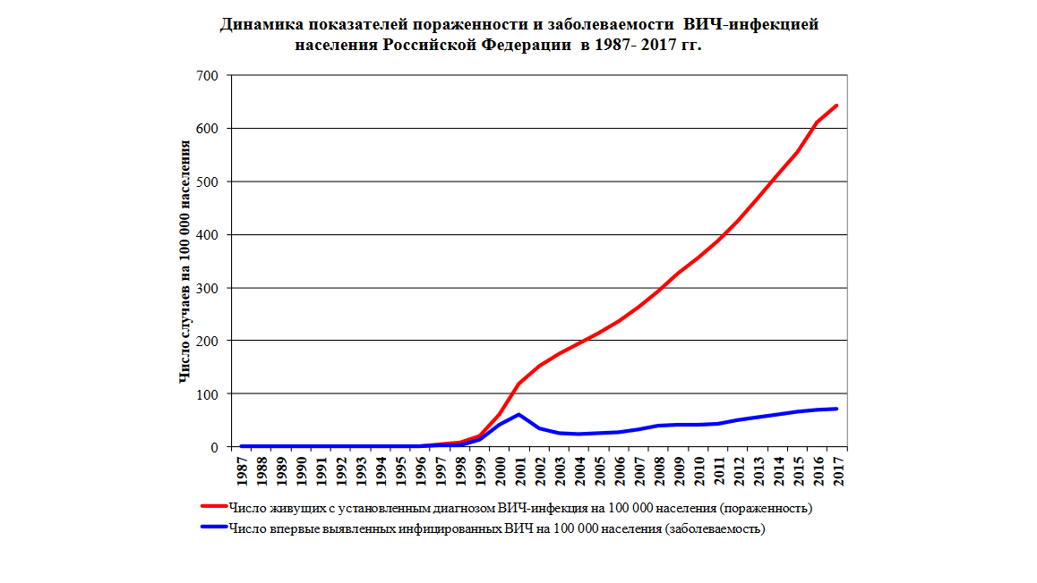 На графике можно наблюдать, как постепенно растёт количество новых (впервые выявленных) случаев ВИЧ-инфекции (синяя линия).