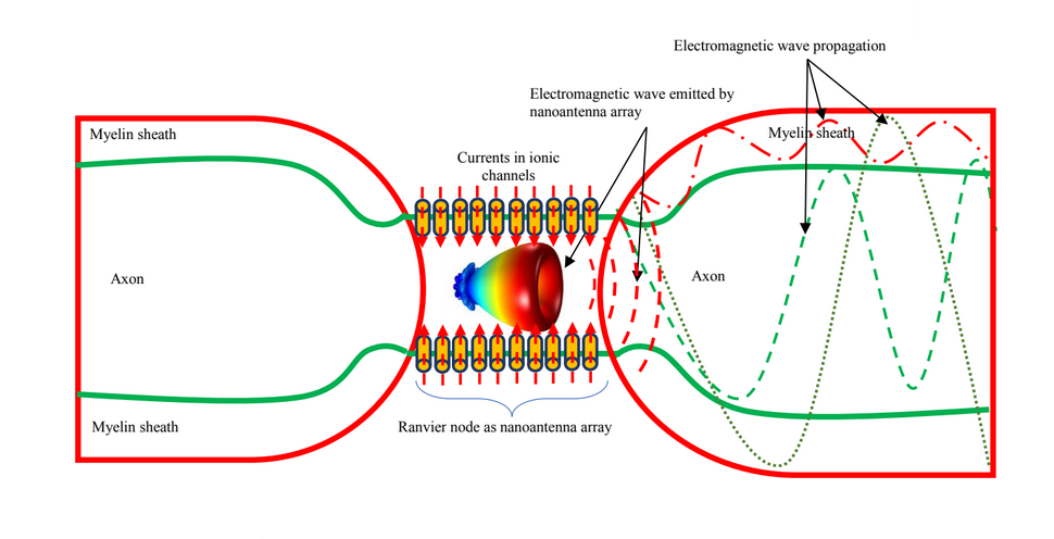 Авторы работы продемонстрировали, что специфическое расположение ионных каналов в перехватах Ранвье превращает их в наноантенны, способные излучать электромагнитные волны в видимом и инфракрасном спектрах.