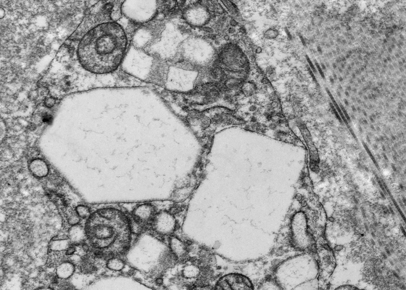 Микрокристаллы цистина в клетке, электронная микроскопия.
