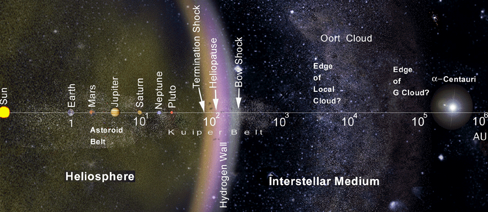 Гелиосфера — это «пузырь» вокруг Солнечной системы, созданный солнечным ветром, то есть в основном потоком заряженных частиц — протонов, электронов, альфа-частиц. Она распространяется далеко за орбиты планет в межзвёздное пространство и защищает Землю от межзвёздного космического излучения. Гелиосфера, как видно на схеме, имеет разную протяжённость в зависимости от направления — тоньше всего она в направлении движения Солнца по орбите в Галактике. Два аппарата «Вояджер» уже прошли эту границу именно в этом направлении (об этом см. отдельную статью). Иногда границу гелиосферы несколько свободно понимают как «границу Солнечной системы», хотя это и не совсем корректно; правильнее говорить о ней как об области, в которой солнечный ветер ещё защищает внутренние участки Солнечной системы от внешнего излучения, или как о начале межзвёздной среды. Под «настоящей» границей Солнечной системы часто имеется в виду граница, дальше которой перестаёт доминировать притяжение Солнца, или сфера Хилла. Она расположена в тысячу раз дальше крайних областей гелиосферы, а «Вояджеры» долетят туда не раньше, чем через 40 тысяч лет.