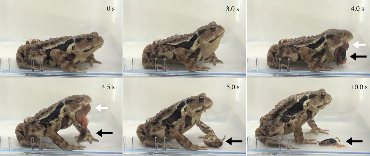 Интересно, что крупные особи благополучно выбирались наружу чаще, чем мелкие, а сравнительно мелких жаб тошнило чаще, чем крупных. «Наши результаты демонстрируют важность соотношения размеров хищника и добычи для успешного бегства добычи из внутренностей хищника».