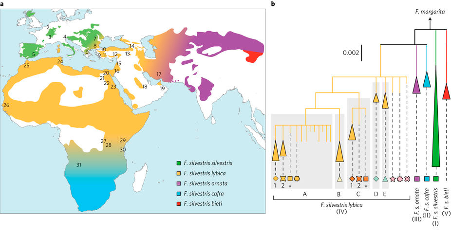 МтДНК степных кошек делятся на 5 субклад, у которых нет четкого географического распределения. Вероятно, это потому, что кошки постоянно перемещались по свету вместе со своими хозяевами — на кораблях, вдоль торговых путей, и к тому же смешивались с дикими родственниками. Авторы статьи прослеживают распространение каждой субклады.