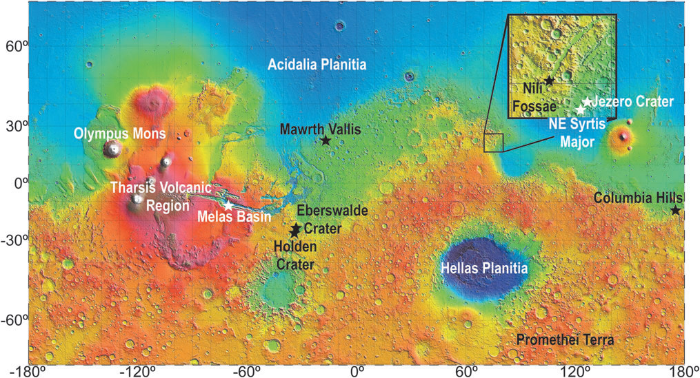 Марс, вероятно, был более привлекательным, чем сегодня, местом в первый миллиард лет существования, или в период его геологической истории, называемый нойской эпохой. Тогда на его поверхности могла существовать жидкая вода. На это указывают и формы рельефа, в частности, русла и конусы выноса рек. Участки с отложениями этой эпохи на поверхности представляют особый интерес для поиска биосигнатур. В ближайшее время ожидается запуск космического корабля, который должен доставить марсоход Perseverance в одно из таких мест (более подробно об этом — по ссылке).