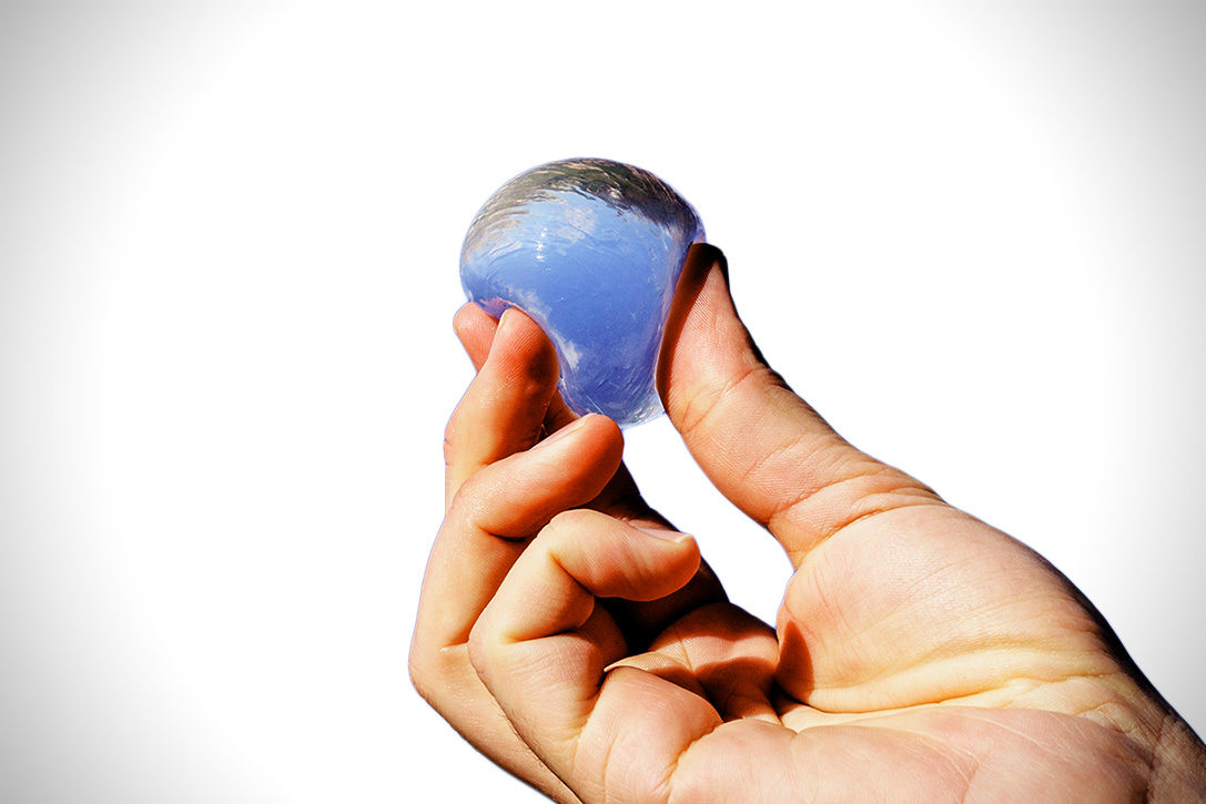 Капсулы под названием Ooho Water (также их иногда называют «съедобными бутылками для воды») изготовлены британским стартапом Skipping Rocks Lab. Мембрана саше сделана из бурых водорослей и хлорида кальция. Технология зарегистрирована под лицензией Creative Commons, так что её может использовать каждый желающий.