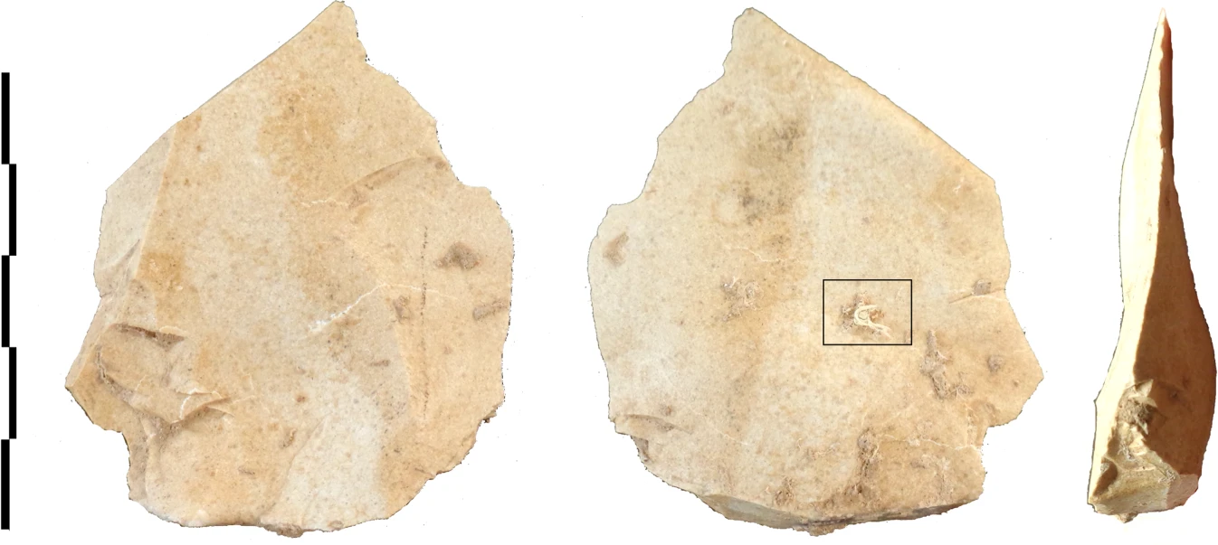 Напомню, что слоям этого памятника среднего палеолита от 90 до 40 тыс. лет, и с 2006 года здесь нашли несколько тысяч каменных орудий. Особый подход археологов заключался вот в чём: найденные архефакты не очищали от земли, а сразу же помещали в герметичные самозаклеивающиеся пакеты и отправляли в лабораторию, а там изучали под микроскопом. Находка, ставшая жемчужиной памятника — невзрачный шестисантиметровый кремневый отщеп G8 128, а точнее — белое пятнышко на его нижней стороне, которое оказалось кусочком скрученных волокон длиной 6 мм и толщиной 0,5 мм. Орудие обнаружили на глубине 3 м, в слое возрастом 41—46 тыс. лет. То, что волокна находились с нижней стороны находки, означает, что они попали в слой или вместе с отщепом, или до него. О древности волокон говорила и покрывавшая их сцементированная осадочная порода.