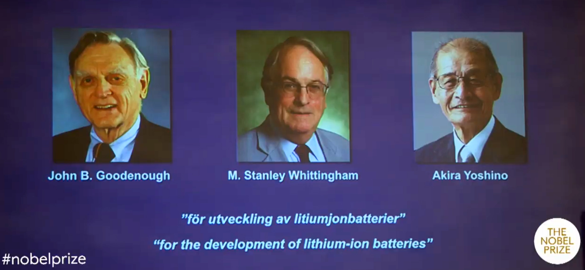 Премию получат трое учёных, сделавших возможной техническую революцию, которую мы наблюдаем в последние десятилетия — повсеместное распространение мобильной электроники. Джон Гуденаф (John B. Goodenough, 1922 г. р.), Стэнли Виттингхем (M. Stanley Whittingham, 1941 г. р.) и Акира Ёсино (Akira Yoshino, 1948 г. р.) оценены как исследователи, внесшие огромный вклад в дело создания и развития литий-ионных батарей.