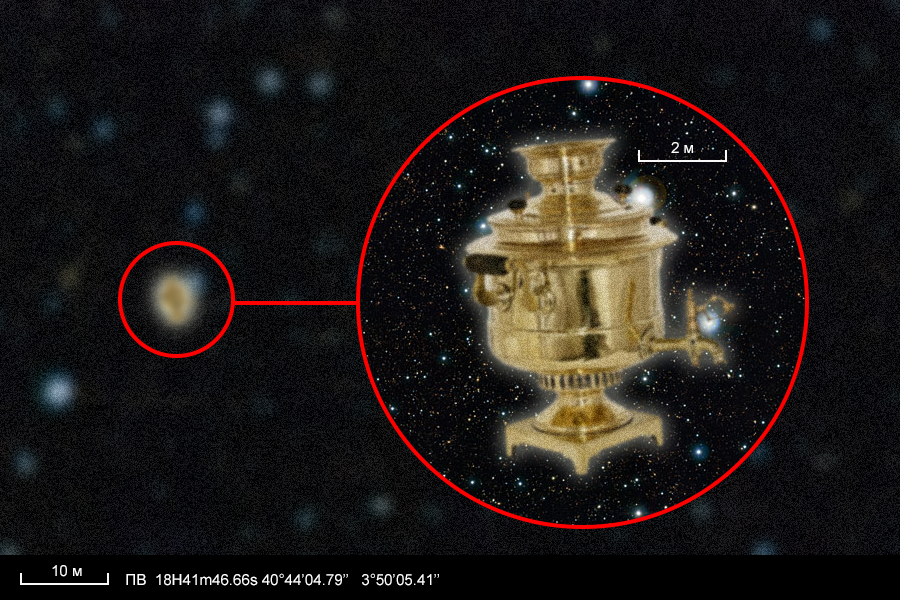 Заведующий обсерваторией игумен Фифтий добавляет: «Мы провели моделирование, и получилось, что возмущения в движении (8331) Dawkins могут быть объяснены наличием ещё не открытого небесного тела. Примерно рассчитав его текущее местоположение, мы стали наблюдать, и наши усилия увенчались успехом! Но особенное удивление вызвала форма нового объекта. Увеличив разрешение изображения божьей помощью и бикубической интерполяцией, мы поняли две вещи. Во-первых, очевидно, что новый открытый объект — не что иное как чайник Рассела. И, во-вторых, Бертран Рассел немного ошибся, ведь его чайник — самовар».