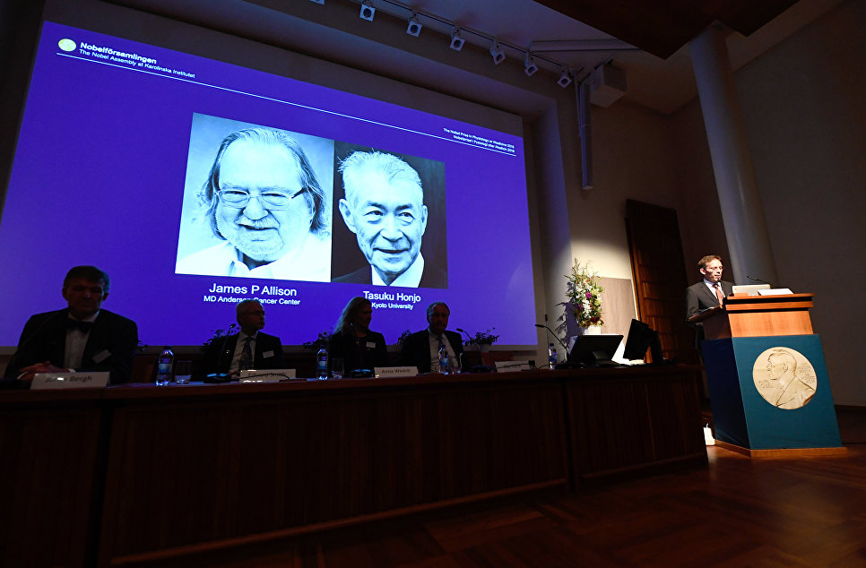 Объявление лауреатов Нобелевской премии по медицине 2018 г. © AFP.