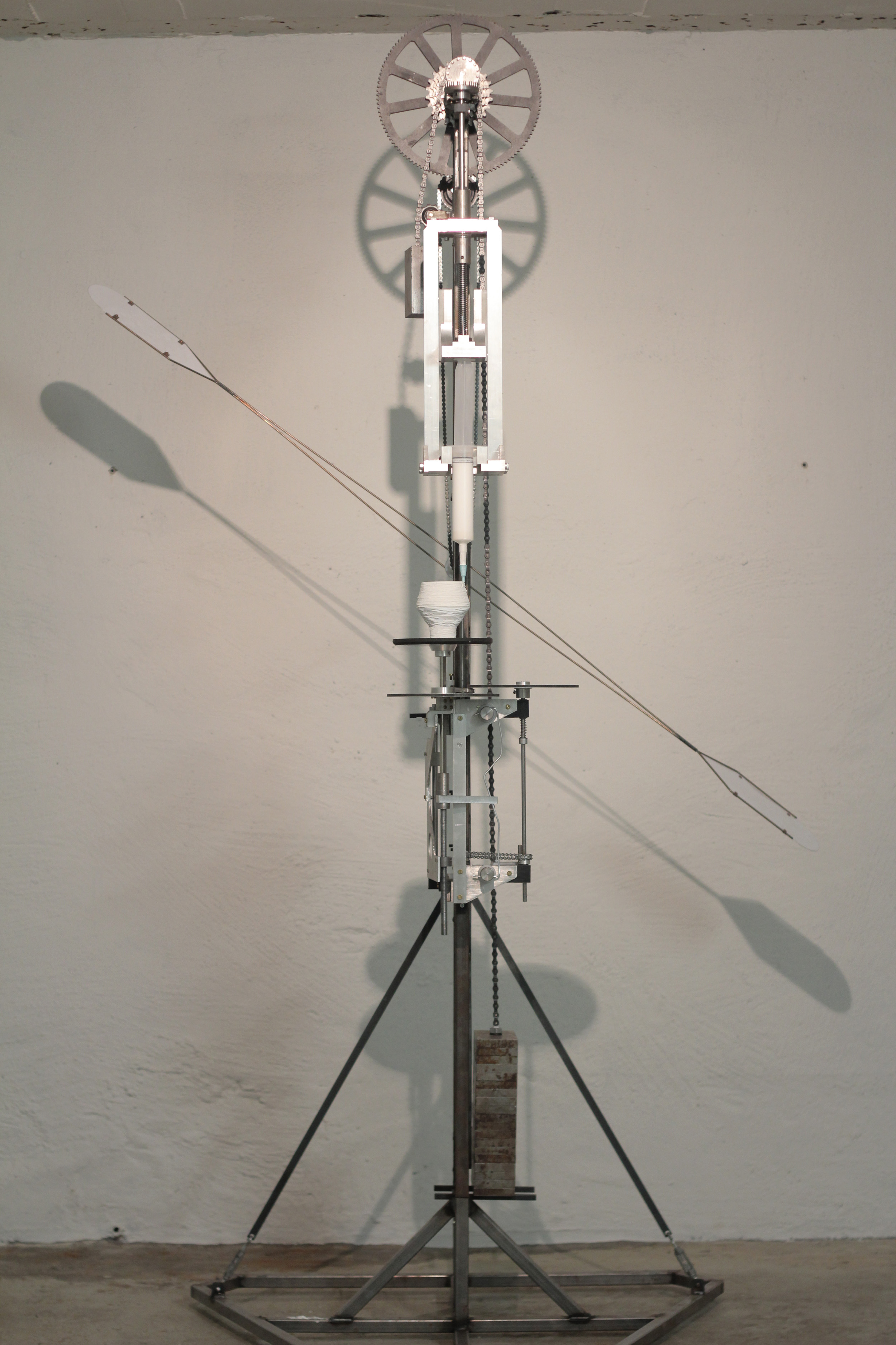 «Я начал с того, что изготовил механизм подачи материала, несущие стойки и гиревой привод. Я тщательно проверял работу этих механизмов, и в то же время рисовал и думал, как сделать платформу для печати. Было много вариантов, о которых я размышлял, выбирая лучший. Самой большой проблемой было добиться одинаковой толщины стенок при изменении радиуса печати. Я решил эту проблему самым простым способом, который смог представить. Экструзия всегда одинакова, так что при печати меньшего радиуса платформа должна вращаться быстрее, и наоборот».