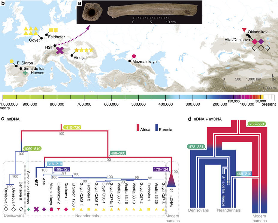 a) Изображение бедренной кости из Холенштайн-Штадель; b) Карта местонахождений древних гоминин, из которых была получена полная мтДНК; c) Родословное дерево современных людей, неандертальцев, денисовцев и гейдельбергского человека из Сима де лос Уэсос на основании данных по мтДНК. В «узлах» на цветном фоне указаны датировки ветвления; d) Родословное дерево неандертальцев, денисовцев и сапиенсов: широкие линии — по ядерной <abbr lang="ru" title="Дезоксирибонуклеиновая кислота">ДНК</abbr>, узкие линии — по мтДНК.