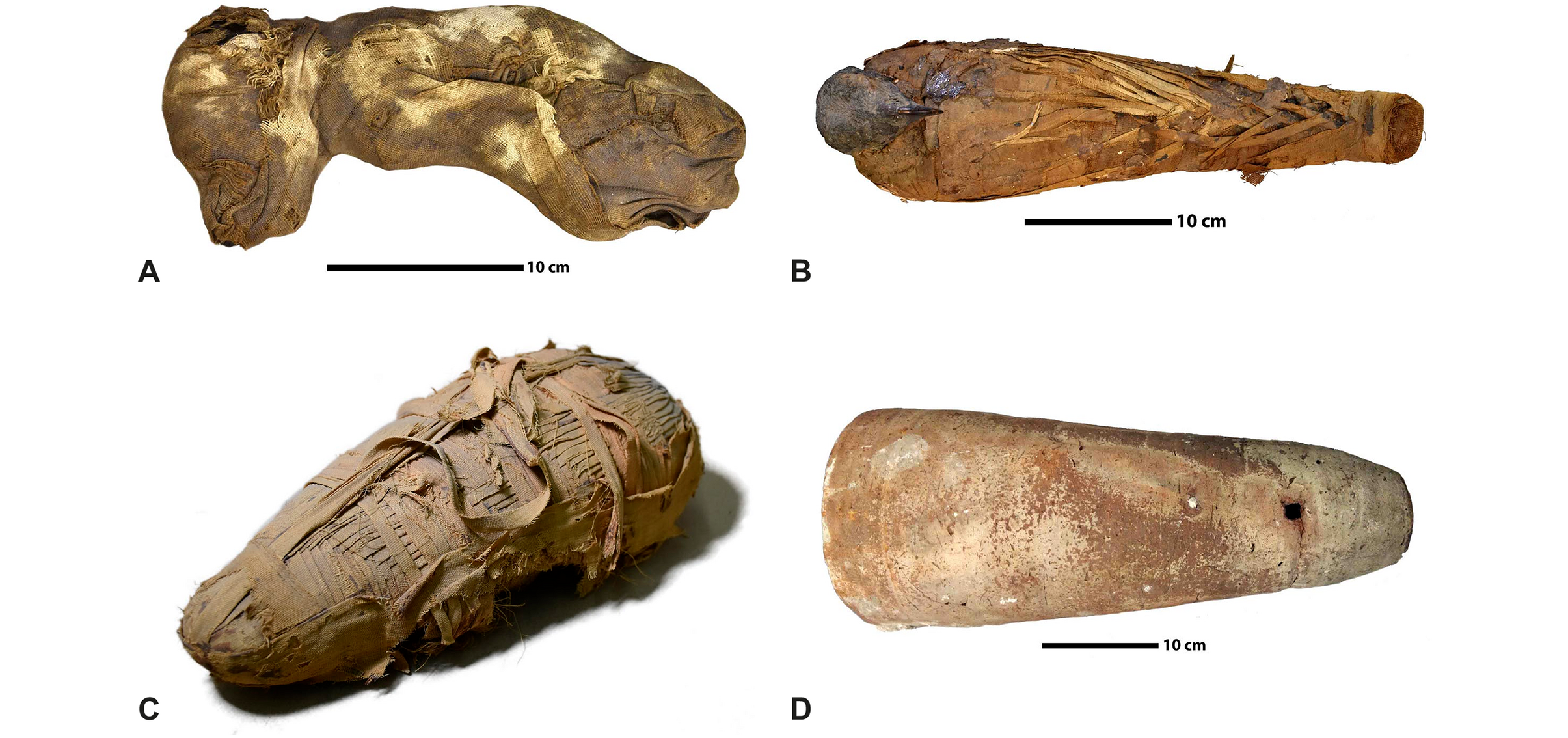 Каким же мумиям «посчастливилось» участвовать в исследовании? Это четыре находки, хранившиеся в музеях Гренобля: щенок, мумия хищной птицы и два ибиса — один завёрнутый в ткань и второй в керамическом сосуде. Все четыре объекта отсканировали в Европейском центре синхротронного излучения (ESRF) в Гренобле.