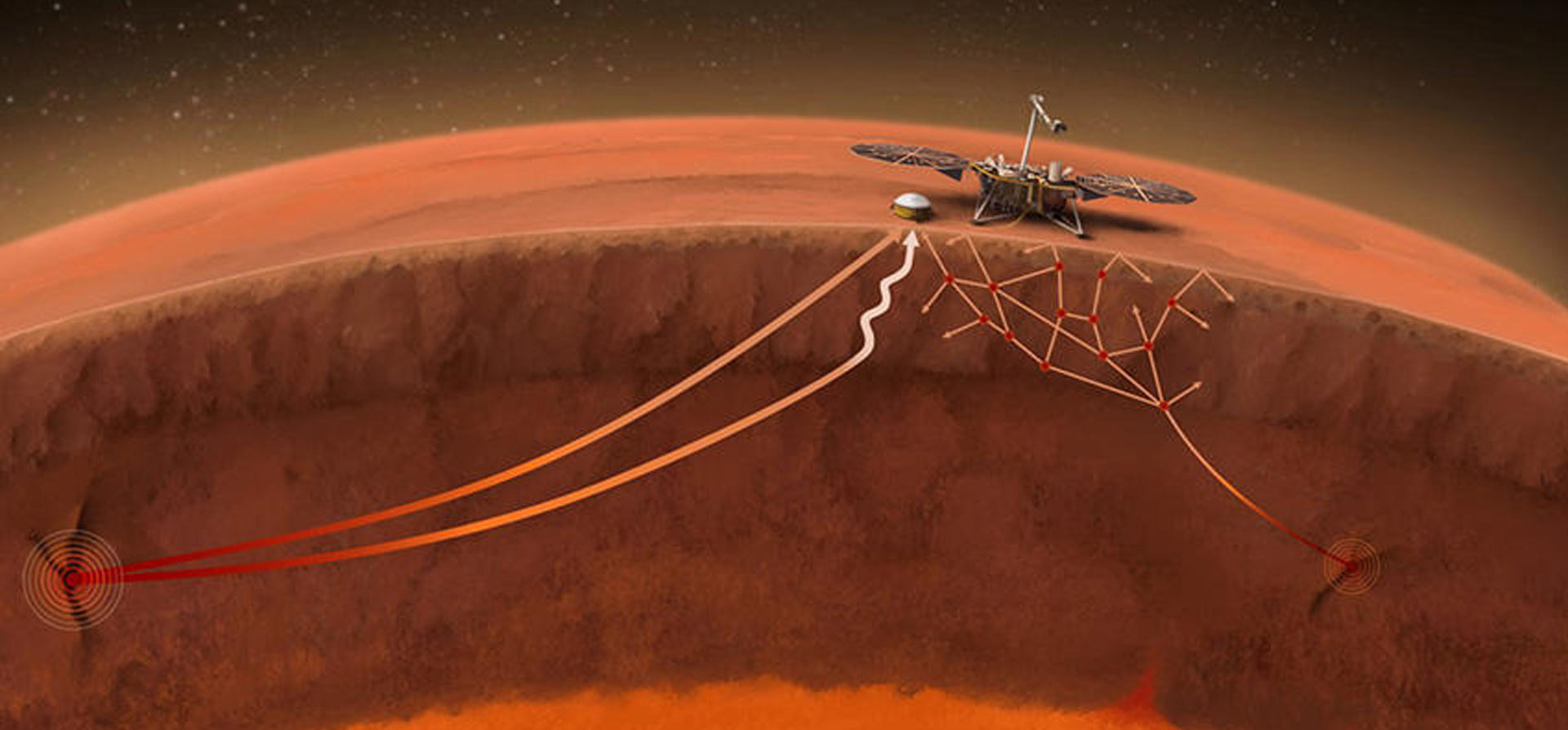 При марсотрясении или другом крупном возмущении вроде падения метеорита от места толчка отходят первичные сейсмические волны (продольные, или P-волны), которые со скоростью порядка нескольких километров в секунду проходят сквозь породы. За ними следуют вторичные (поперечные, или S-волны) с меньшей скоростью. В продольных волнах колебания среды происходят в направлении вдоль распространения волны, в поперечных — перпендикулярно вектору распространения. Более подробно про структуру этих типов волн можно прочитать во вставке к уже упомянутой статье о марсианской сейсмотомографии. Кроме продольных и поперечных волн внутри вещества ещё выделяют несколько типов поверхностных волн, которые распространяются вдоль границ раздела двух сред (например, это волны на море). Все эти многочисленные разновидности сейсмосигналов так или иначе можно использовать для исследования внутренней структуры планеты. Измерение промежутка времени между приходом волн позволяет определить, как далеко произошло землетрясение, потому что отставание более медленной волны увеличивается по мере удаления от источника. Сейсмические волны проходят через разные вещества с разной скоростью, что даёт возможность даже определить химический состав пород внутри планеты. При этом, конечно, анализ проводится с опорой на данные по составу Земли в предположении, что структура внутренних слоёв у планет должна быть хотя бы примерно похожей. Из более тысячи зарегистрированных марсотрясений для анализа использовали только около десятка с наибольшей амплитудой толчков.