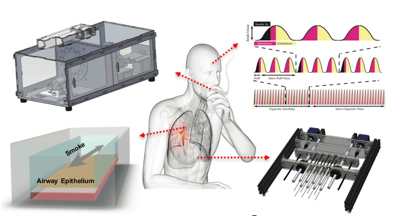 Устройство состоит из установки, похожей на барабан револьвера, в котором патроны заменили сигаретами, и небольшого аппарата искусственного дыхания, имитирующего вдох и выдох. Поступление воздуха отрегулировали таким образом, чтобы робот «затягивался» как среднестатистический курильщик. Дым попадает на небольшой чип, разделённый мембраной на две камеры. Верхняя — устлана клетками лёгочного эпителия, а в нижнюю поступают питательные вещества, необходимые для поддержания жизни клеток. Такие «органы на чипе» позволяют учёным воспроизводить работу не просто отдельных клеточных культур, но целых систем организма.