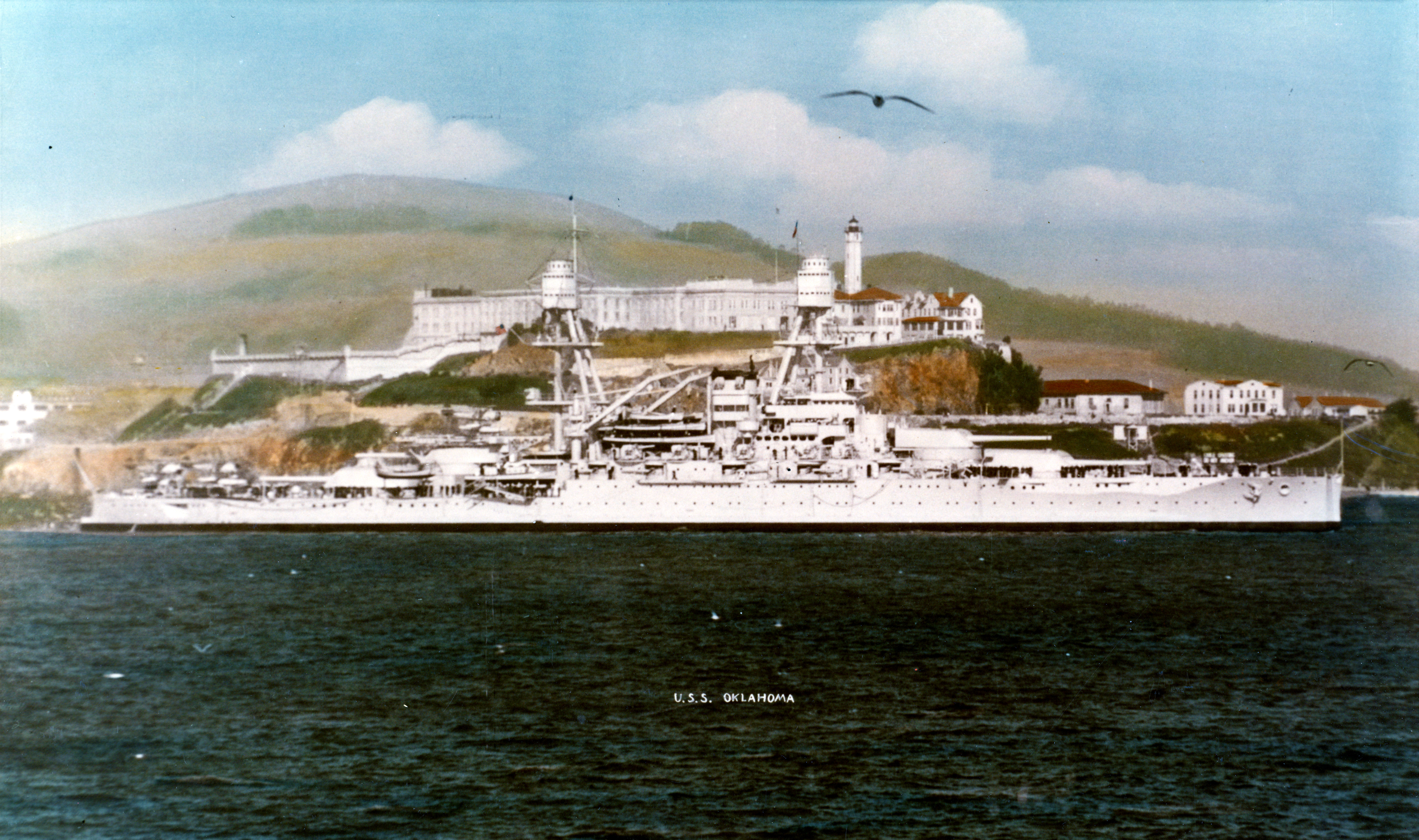 USS Oklahoma (BB-37) проходит мимо острова Алькатрас. Фото: U.S. Naval History and Heritage Command Photograph.