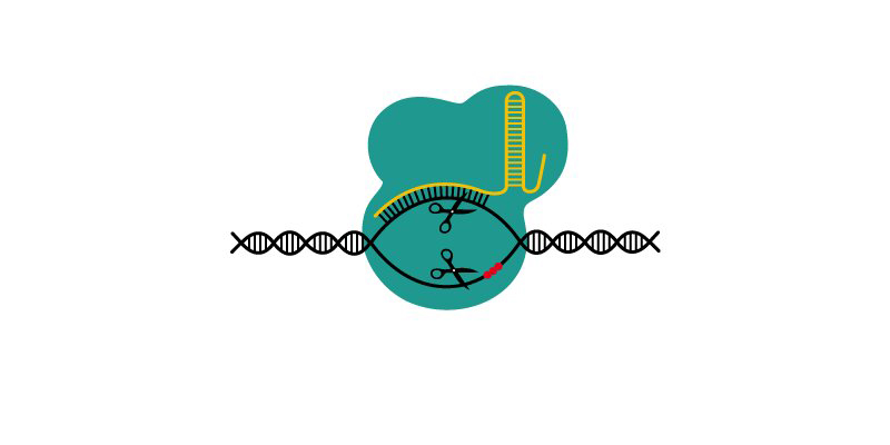 Система CRISPR для расщепления ДНК использует фермент Cas9. Он может вырезать почти любую последовательность ДНК. Его специфичность обусловлена взаимодействием с гидовой РНК (гРНК, gRNA), последовательность которой позволяет ему связываться с ДНК-мишенью посредством сопоставления пар оснований. Как только это происходит, фермент активируется и ДНК разрезается.