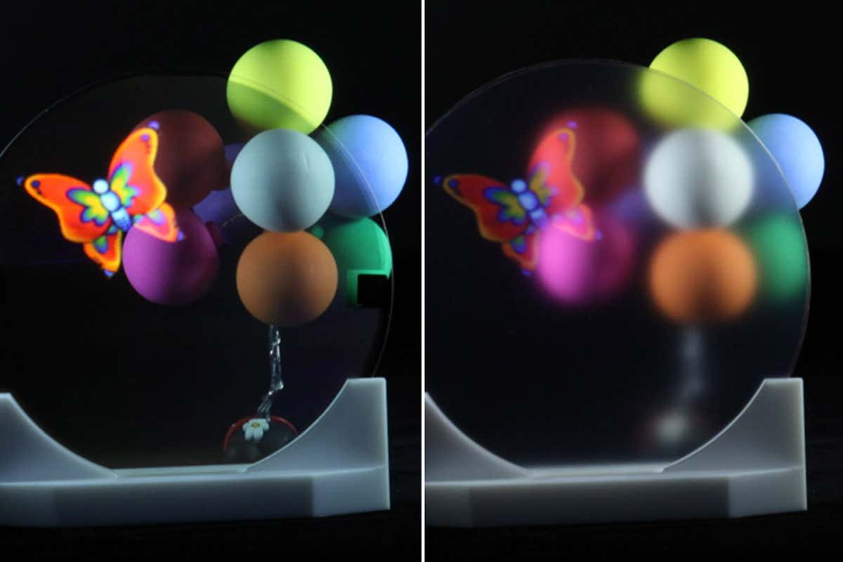 Объекты, наблюдаемые через безбликовый материал, выглядят отчётливо, в то время как обычная антибликовая плёнка (справа) размывает изображение. Му Ванг и др./Нанкинский Университет