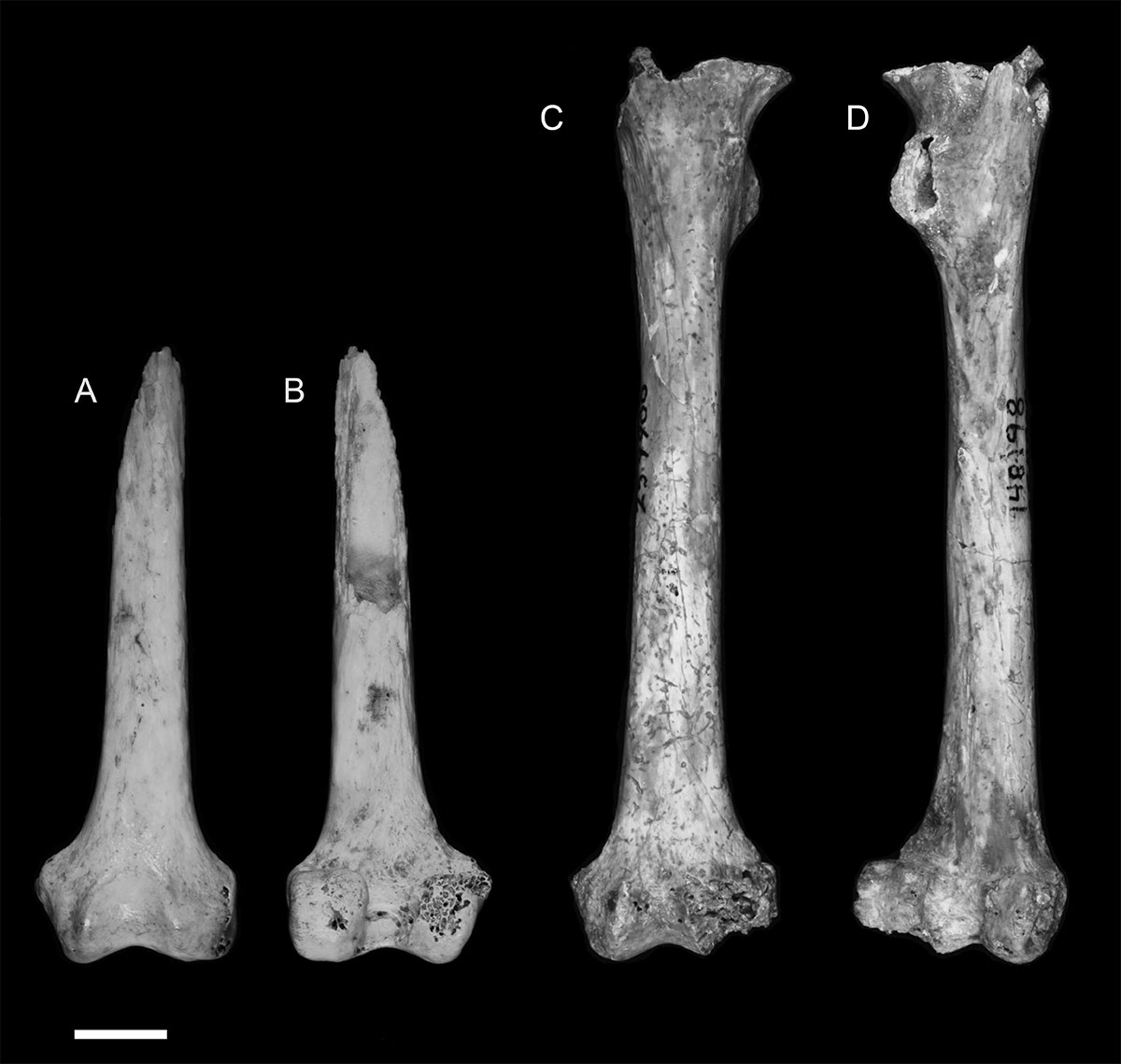 Бедренные кости Xenothrix mcgregori: А, B — найденная в пещере Сомервилль, C, D — найденная в пещере Лонг Майл.