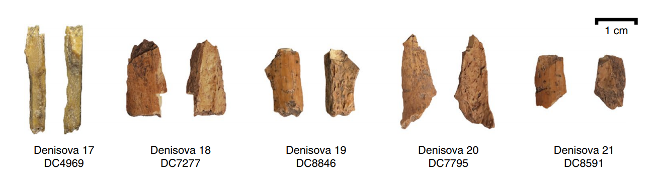 Большинство костей принадлежали крупным растительноядным животным — быкам, лошадям, оленям, а также хищным. Тем не менее, в пяти образцах — четыре из слоя 15 и один из слоя 12 — исследователи обнаружили характерный автограф человекообразных приматов. Учитывая, что шимпанзе или орангутанов на Алтае ещё никто не встречал, исследователи сочли, что кости, вероятно, человеческие. Однако разрешающая способность метода не позволяла определить видовую принадлежность — и в дело пошла митохондриальная ДНК. Исследователям удалось прочесть полные митохондриальные геномы четырёх костей из пяти, причём с приличным качеством. Денисова 17 (единственная косточка из слоя 12) оказалась неандертальской, а остальные — Денисова 19, 20 и 21 — попали в диапазон изменчивости денисовцев.