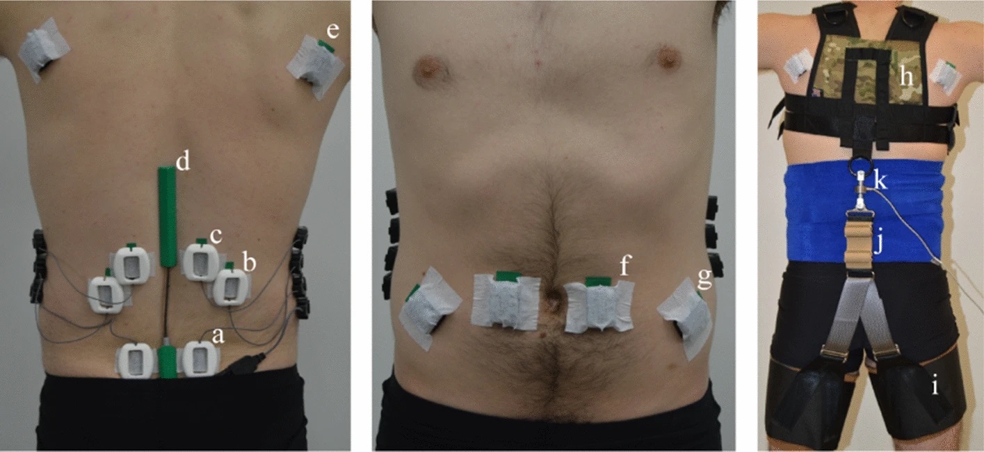 Фото с испытаний: a, b, c, e, f, g — электромиографические датчики, d — цифровой гониометр для измерения углов наклона туловища, h — верхняя часть прототипа «экзосьюта», i — бедренные части, j — эластичный элемент, соединяющий верхнюю и бедренные части, k — одноосный тензометрический датчик.