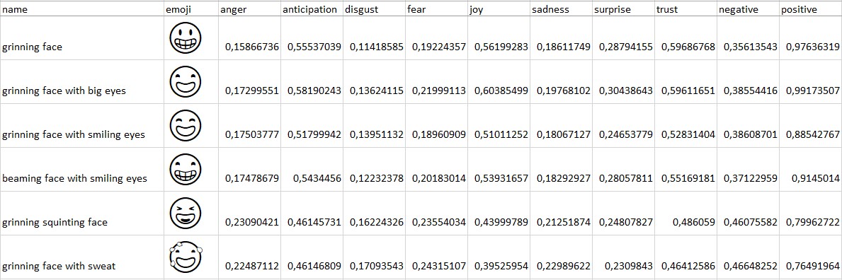 И вот «среднее по больнице» эмоциональное значение каждого из этих 359 эмодзи и надо было определить. Как это сделать? Исследовательницы использовали для этого NRC emotion lexicon — подготовленный в 2013 году с помощью Mechanical Turk от Amazon под эгидой Национального исследовательского совета Канады (NRC) массив данных, представляющий собою список английских слов, каждое из которых двоичным образом (0 — нет, 1 — да) определено как относящееся или нет к каждой из восьми избранных эмоций (гнев, предвкушение, отвращение, страх, радость, печаль, удивление/неожиданность {surprise}, доверие) и двум более общим ощущениям настроения (позитивное и негативное). Слова составители брали из Тезауруса Роже, причём только те из них, которые встречались в корпусе Google Ngram более 120 тыс. раз.