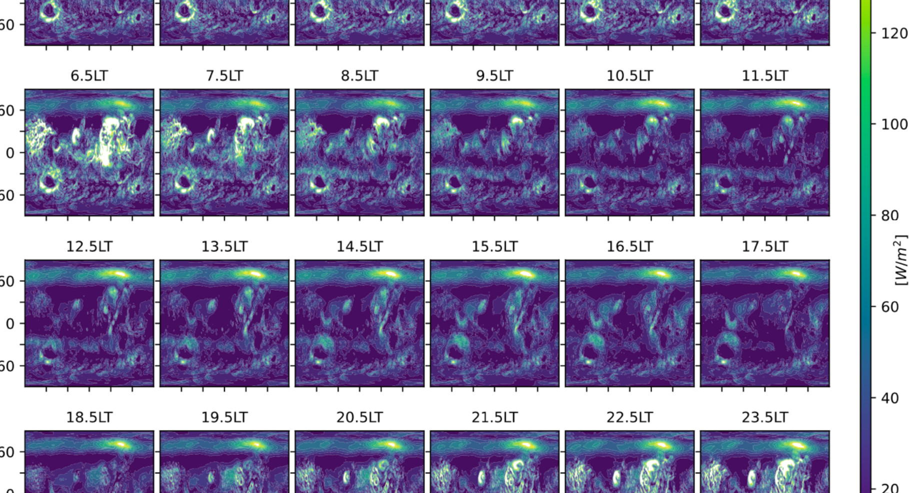 Планетологи промоделировали распределение энергии ветра в разных областях Марса в зависимости от времени…