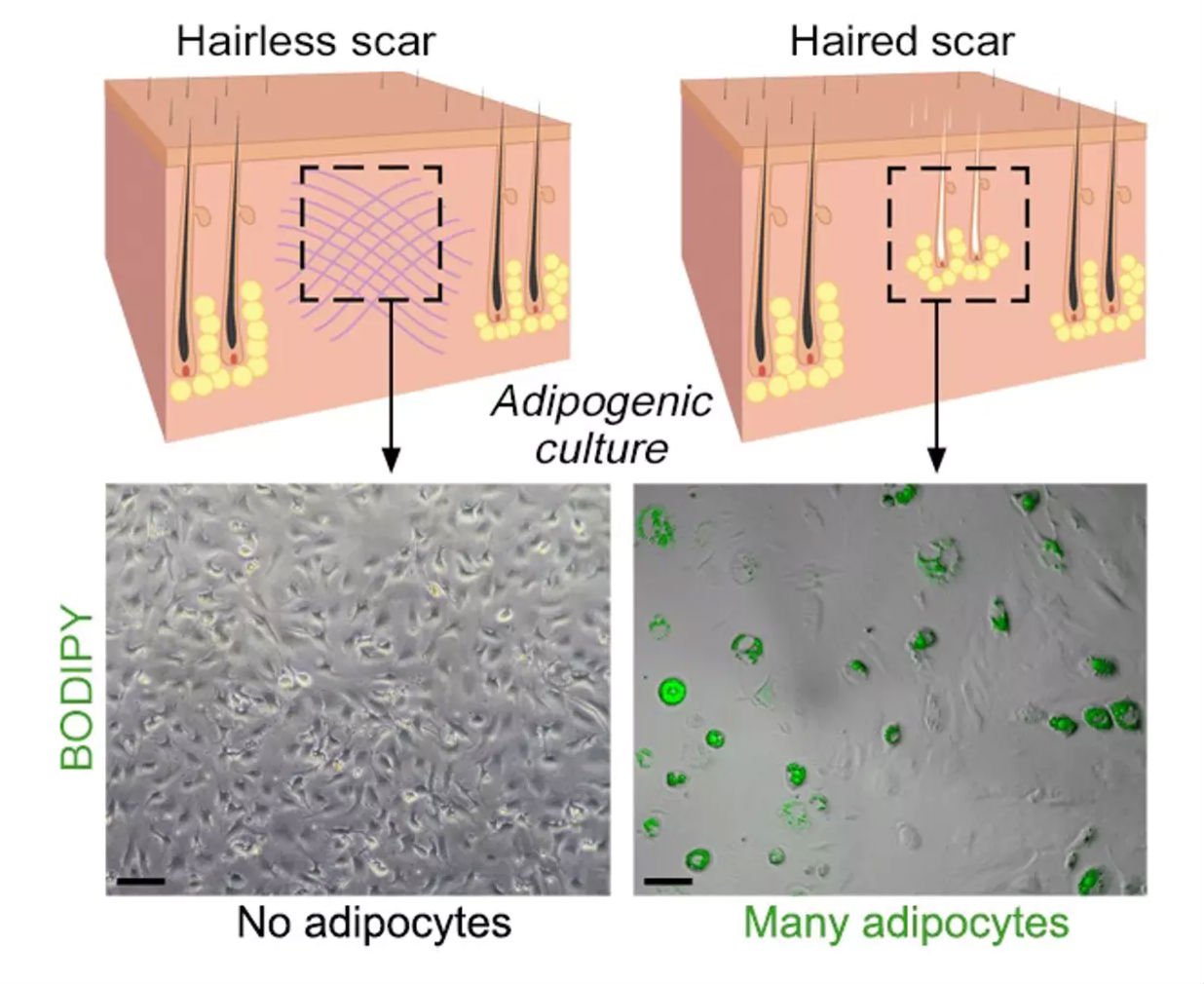 В естественных условиях ничего подобного не происходит, поскольку рубцовая ткань не содержит волосяных фолликул. Однако в эксперименте было показано, что фолликулы, формируясь, начинают выделять так называемый «костный морфогенетический белок». И именно он способствует превращению миофибробластов в адипоциты.