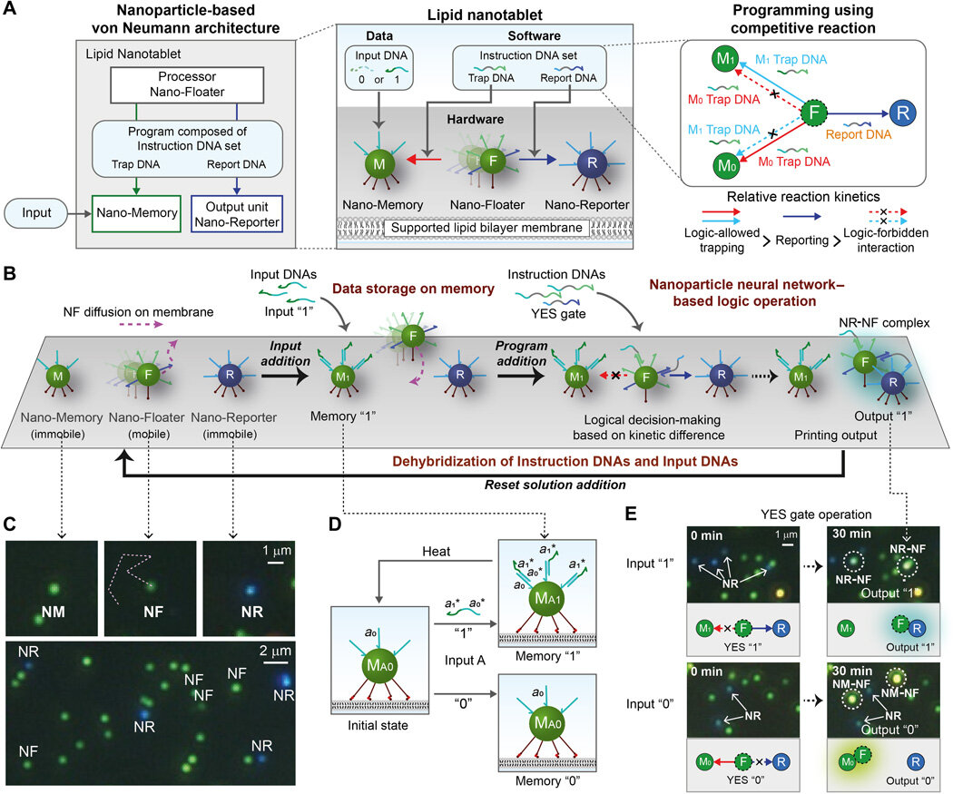Создание масштабируемых вычислительных архитектур на основе наночастиц наталкивается на ряд ограничений, затрудняющих их применение для обработки информации с помощью молекулярных вычислительных схем (ДНК-компьютеров). Группа корейских химиков из Сеульского национального университета представила перепрограммируемый наночастичный «биокомпьютер» на подложке в виде липидной мембраны. Наночастицы на липидном чипе выполняют роль аппаратного обеспечения, эмулируя устройства памяти, процессор и устройства вывода. Программным обеспечением выступают цепи ДНК, которые передают управляющие команды для программирования логических схем. Такая молекулярная архитектура позволила создать наночастичную нейросеть с прямой связью, или перцептрон. Система может выполнять полный набор булевых операций, при этом является программируемым и масштабируемым устройством с возможностью перезагрузки (сброса в исходное состояние). Статья по результатам исследований вышла в начале сентября 2020 года в Science Advances.