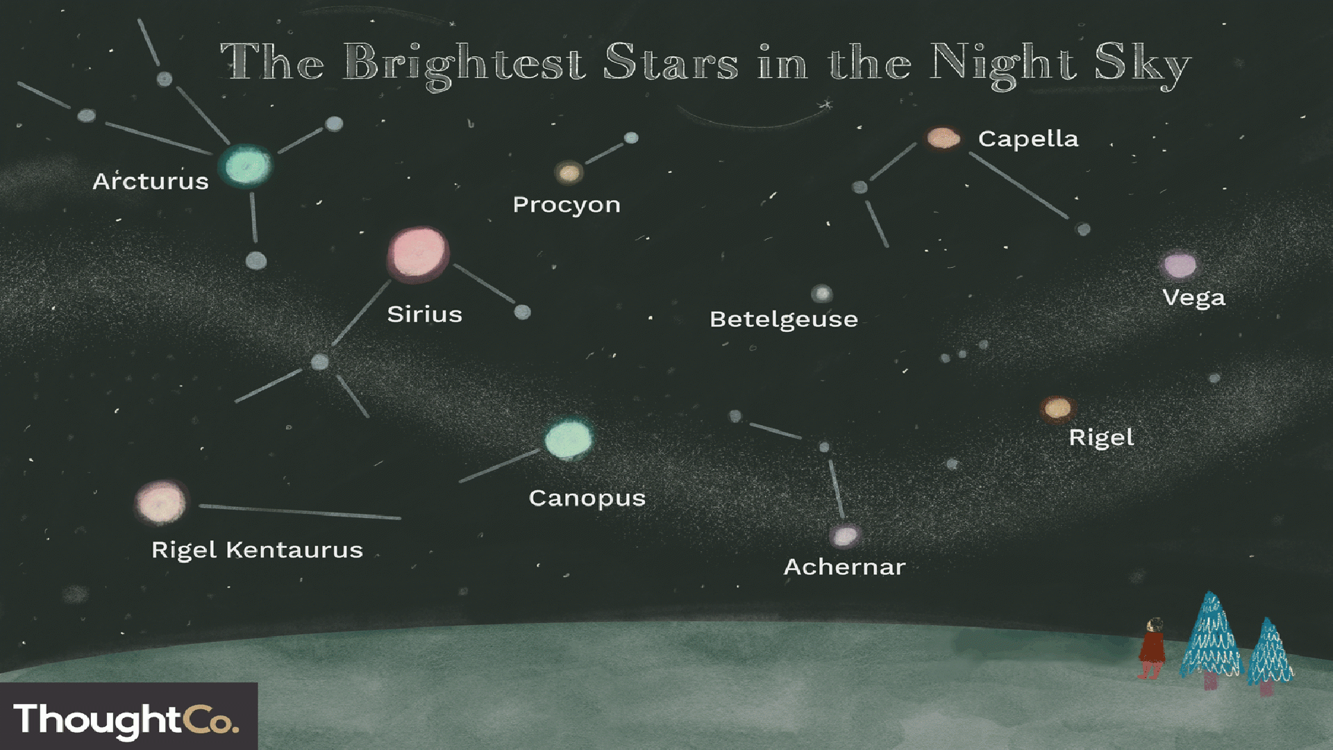 Эта заметка — справочник по десяти самым ярким звёздам на ночном небе и некоторым сопутствующим объектам, упорядоченным по их относительному расположению на небесной сфере.