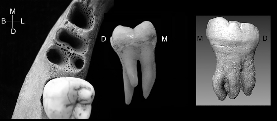 Дело в том, что у человека обычно у нижних коренных зубов два корня, но иногда встречаются вариации — один корень, три или даже больше. Трёхкорневые моляры могут вырасти либо только с одной стороны, либо с двух. Показано, что признак наследуемый: если у одного близнеца такие зубы, то с высокой вероятностью у второго тоже. Интересно вот что: если у европейцев или африканцев трёхкорневой вариант редок (частота встречаемости менее 3,5 %), то у некоторых групп монголоидов или коренного населения Америки — сплошь и рядом, с частотой до 40 %. Это, кстати, говорит о родстве монголоидов и коренных американцев. Обнаруживали такую особенность и у древних азиатов — например, у неолитических людей с территории Китая. Но только у не слишком древних. У найденных азиатских эректусов и у ранних сапиенсов Азии число корней нижних моляров не превышало двух. Конечно, надо сделать оговорку: знаменитым синантропам Чжоукоудяня рентген нижних челюстей не делали, а сейчас это, к сожалению, невозможно — вся коллекция пропала в годы II Мировой войны. Тем не менее, за неимением древних свидетельств, исследователи полагали, что трёхкорневой нижний моляр — особенность, возникшая относительно недавно, уже после разделения мигрировавших в Евразию сапиенсов на восточную и западную ветви.