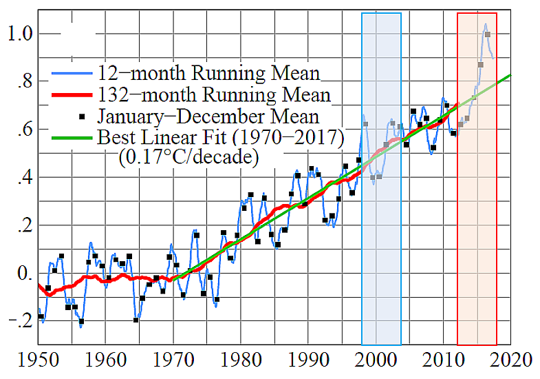 Рисунок 1. Глобальные аномалии приповерхностной температуры воздуха (до ноября 2017), по данным NASA GISS (Источник: http://www.columbia.edu/~mhs119/Temperature/).