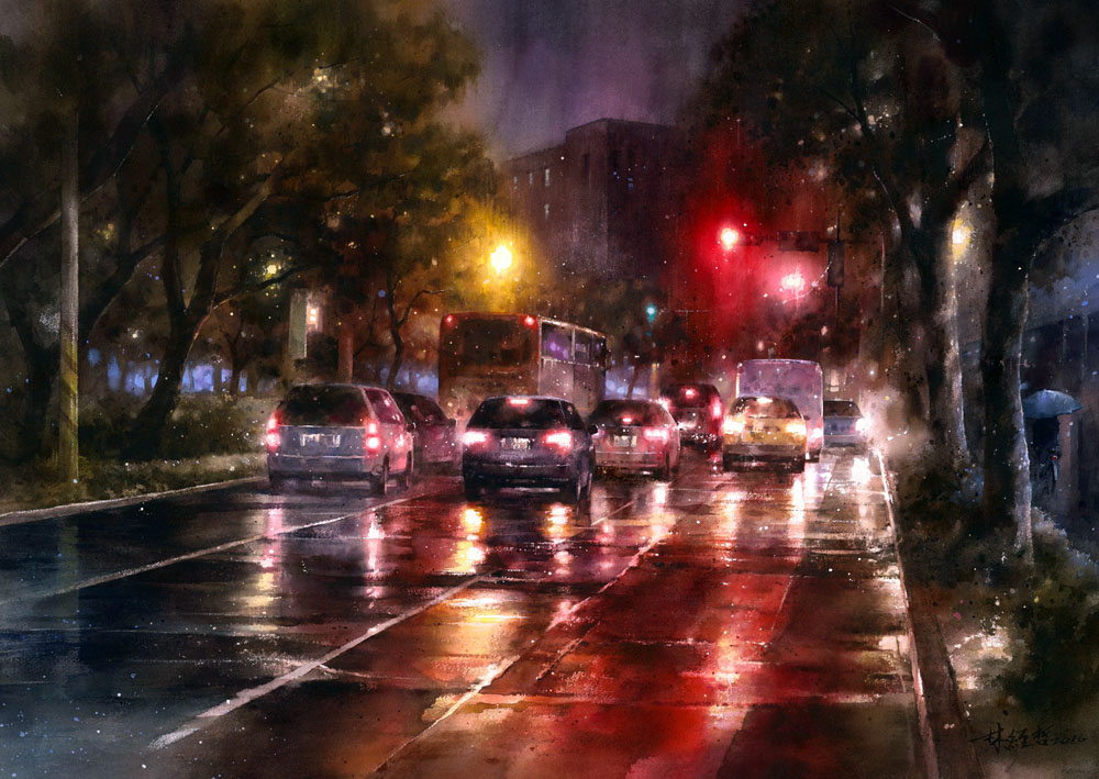 Однако это — реальная акварельная работа. Я, правда, подозреваю, что автор всё-таки использовал фотографию, а не шпарил по памяти — ведь с натуры временно остановившиеся автомобили он вряд ли успел бы нарисовать.