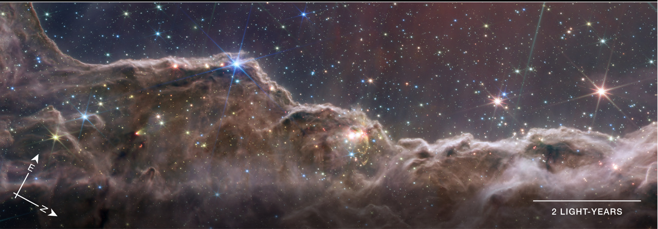 Туманность NGC 3324 — это северо-западный край Туманности Киля (Carinae Nebula NGC 3372). Эта область представляет крупное скопление водорода и содержит много молодых ярких звёзд. Туманность Киля расположена на расстоянии 7600 световых лет. Снимок получен при помощи камеры ближнего инфракрасного диапазона NIRCam. «Холмы» на снимке имеют характерные размеры 7 световых лет и окружают газовую полость внутри туманности, созданную действием излучения и звёздного ветра от горячих звёзд в центре этого пузыря (регион звёзд находится за пределами поля снимка сверху). Можно сравнить детальность этого изображения со снимком этого же участка, сделанным телескопом «Хаббл» .