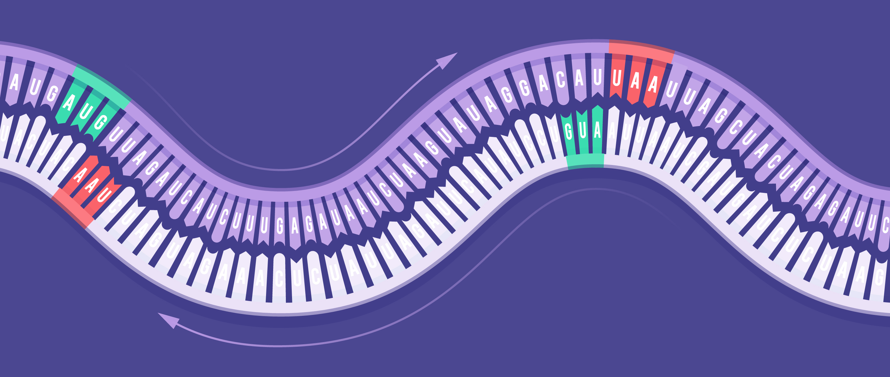 Чтобы понять, почему обширный набор перекрывающихся генов не является нормой, нужно знать, как РНК и ДНК передают информацию. Они записывают свои инструкции по производству того или иного белка в виде последовательности «кодонов» — трёхбуквенных слов, таких как CGA. Каждый кодон предписывает клетке либо синтезировать аминокислоту (строительный блок белка), либо завершить белковый синтез.