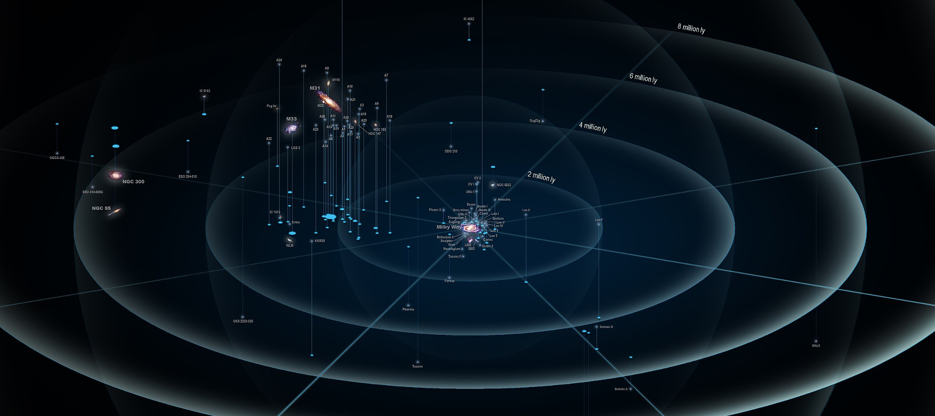 На реконструированных изображениях — галактика Андромеда (M31), Треугольник (M33), а также Большое и Малое Магеллановы облака — карликовые галактики, вращающиеся вокруг Млечного Пути и не имеющие спиральной структуры, как Андромеда или Треугольник. Все объекты находятся на расстоянии до трёх миллионов световых лет — это как раз Местная группа галактик, в которой доминируют две «соседние» спиральные галактики, окружённые множеством галактик-спутников. Напомним, что обозначения Mxx — это каталог Мессье (Messier) конца XVIII века, в котором астроном впервые систематически описал несколько десятков объектов глубокого космоса — галактик и туманностей, которые под силу было рассмотреть при помощи оптики того времени.