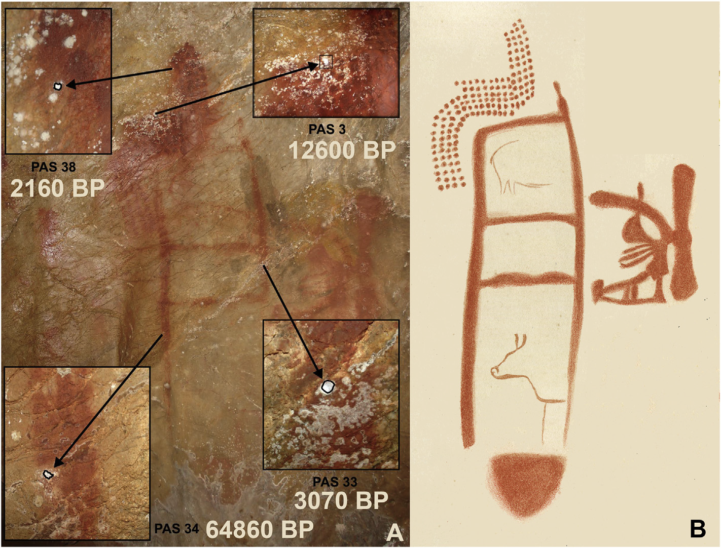 Изображение в пещере Ла-Пасьега. А. Показаны места взятия образцов для датирования и полученные даты. В. Отрисовка рисунка. Обратите внимание на «зооморфов».