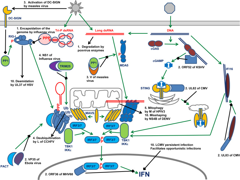 ИФН-индуцирующие пути показаны зелёными стрелками. Пути вирусного противодействия представлены чёрными линиями и стрелками. Числа указывают на конкретные стратегии, описанные в тексте.