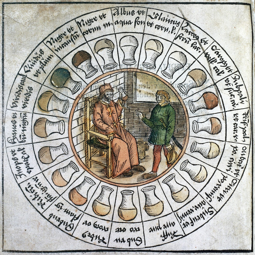 Средневековые доктора интересовались мочой своих пациентов, поскольку она обеспечивает немедленное представление о гуморальном состоянии организма. До открытия Уильямом Харви (William Harvey) циркуляции крови (а это случилось только в XVII веке, работа Харви была опубликована в 1628 году) врачи полагали, что главной целью пищеварения является превращение пищи в кровь, которая постоянно расходовалась. Следовательно, запасы её должны были восполняться — полагали, что это происходит во время сна. Считалось, что пищеварение ― сложный многоступенчатый процесс, он приводит к появлению различных отходов, в частности — мочи, в которой есть «следы» органов, участвующих в этом процессе — включая желудок, кишечник, печень и почки. Таким образом, если тело слишком горячее или слишком холодное, или его жидкости не сбалансированы ― это неизбежно должно проявиться в производимой моче.