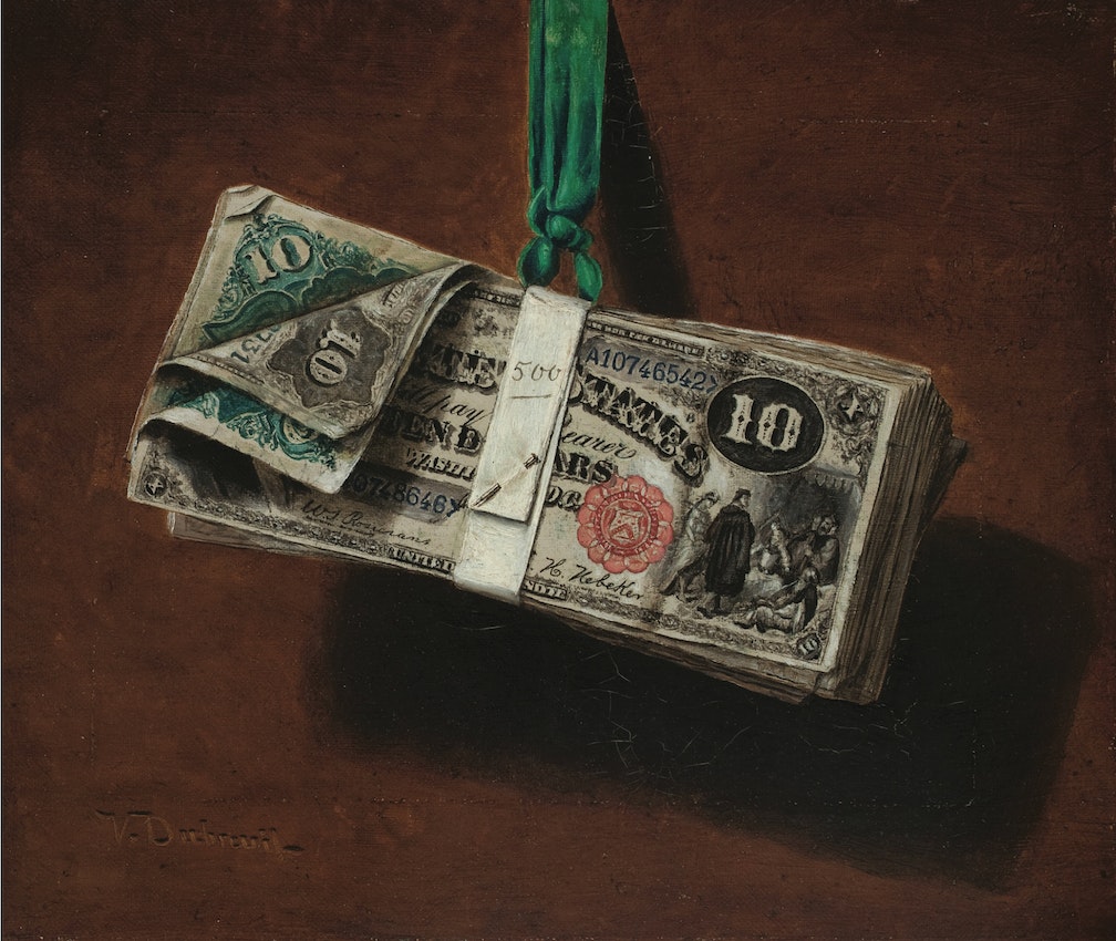 Здесь он взялся писать изумительные картины с долларовыми банкнотами в стиле trompe l’oeil (оптического обмана). В статье Доринды Эванс дана новая оценка этим произведениям искусства, которые когда-то ассоциировались с изготовлением фальшивых денег и подлежали конфискации министерством финансов США.