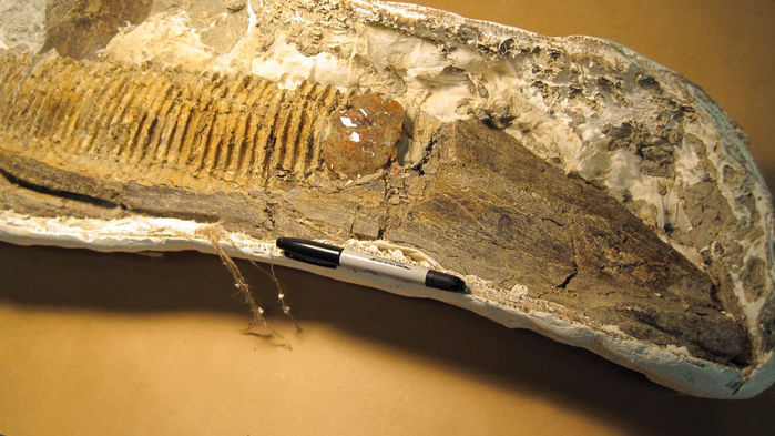 Челюсть утконосого динозавра с прилипшей к ней крупной каплей янтаря